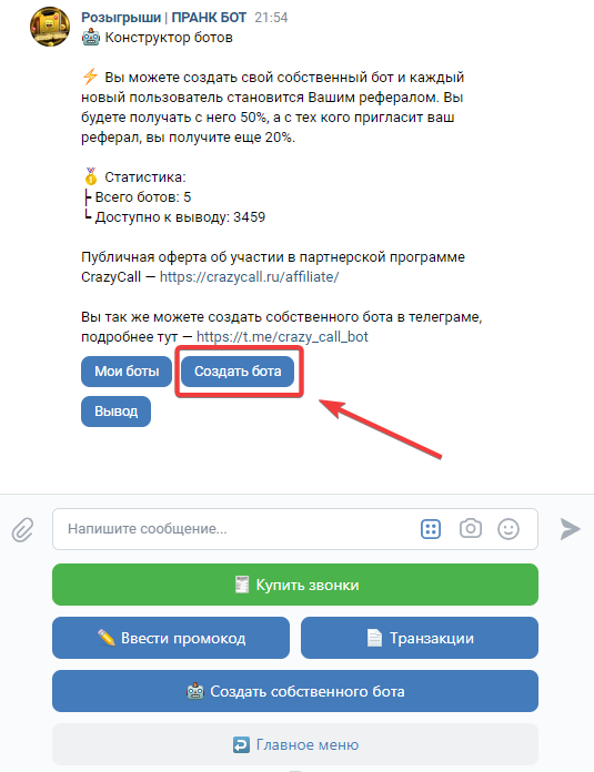 В CrazyCall каждый пользователь твоего бота становится твоим рефералом. Ты получаешь 50% с его пополнений и дополнительно 5% с тех, кого он пригласит дальше. Всю статистику можно смотреть прямо в боте.